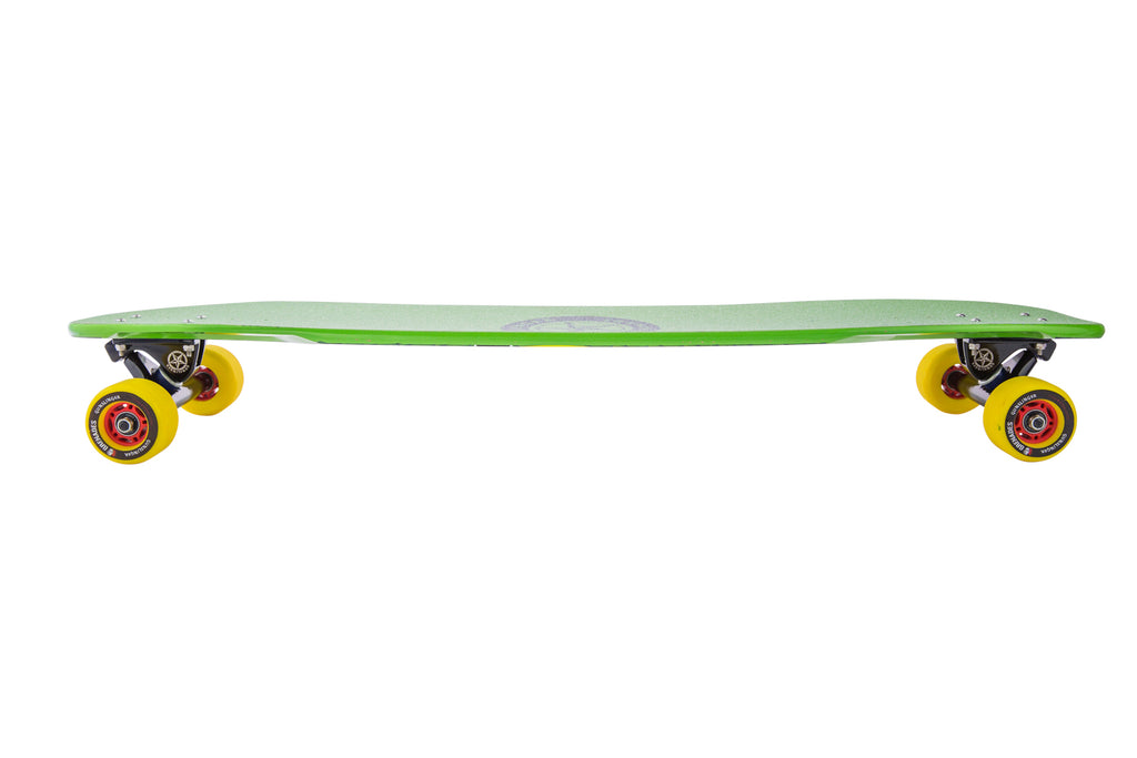 This slippery sucker slithers down a freeride hill and snakes freely around corners at speed. This is in due part to the rocker, with the deck bending downward into smooth arc, allowing easier turning in the front and rear trucks. This also makes it good for long distance pushing as the deck is lower to the ground.